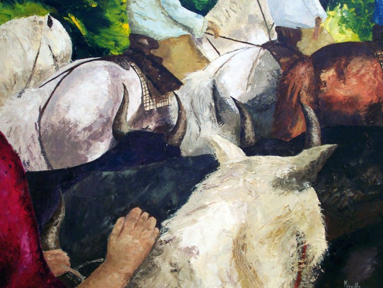 Sur l’affiche, avec la fontaine du Griffe et des silhouettes de gardians en arrière-plan, une dizaine de personnes (femme, enfant, hommes) et un chien tentent de fuir, de stopper ou de pourchasser un taureau visiblement furieux ! et surtout on n’oublie pas la bouteille de pastis et la chopine de bière !