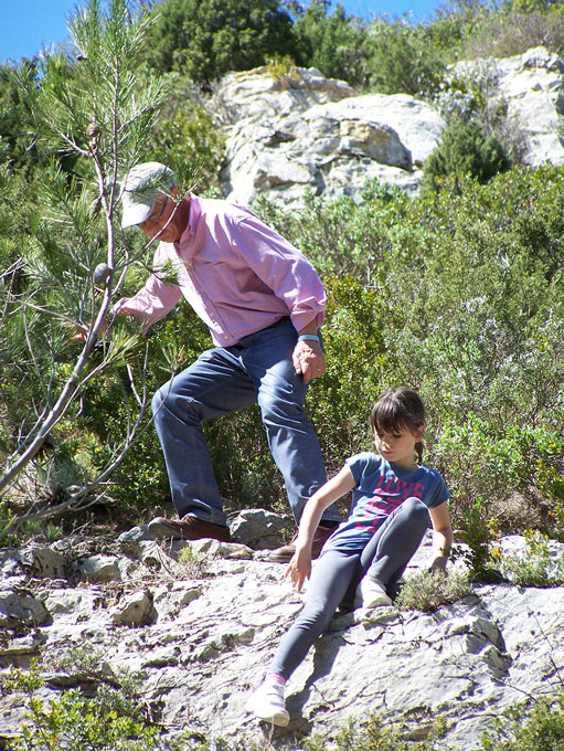 Pour le pique-nique, Rémy le coureur de bois nous a dégoté un petit coin tranquille et ensoleillé…les tartes salées, taboulés, pâtés cornichons et autres ripailles n’ont pas fait long feu…ce temps de repos n’a pas arrêté l’intrépide Laura haute de ses 8 ans qui a entraîné à l’escalade Marie-Françoise, Philippe, Rémy…la montée fut aisée pour tous mais la descente moins facile pour certains…