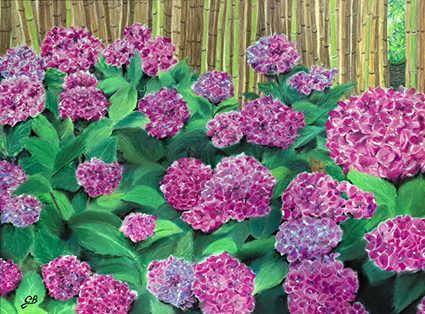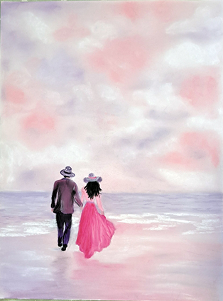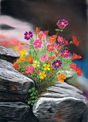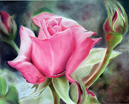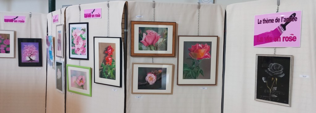 Le thème de l’année : LA VIE EN ROSE. Thème bien suivi et inspirant qui a permis un certain lâcher-prise sur les sujets…petit cochon en robe, grotte illuminée, rose noire et partition de musique, carrosserie de voiture, camelles de sel en Camargue, statue de femme guettant l’horizon et aussi paysages, fleurs et flamants roses (ou bleu), sans oublier un magnifique vitrail.