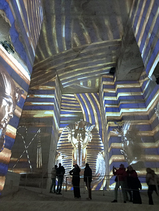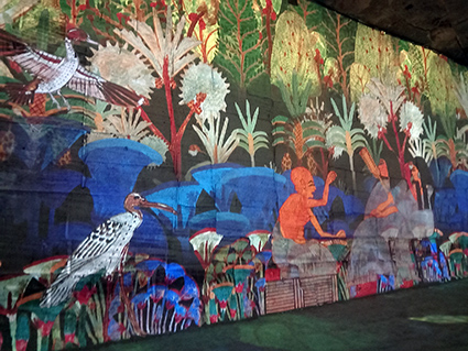 Les tableaux mouvants ou fixes se succèdent sur les immenses parois des carrières et de la pénombre surgit en continu des cascades d’images de couleurs et d’ors. On en prend « plein les yeux » sans oublier l’accompagnement musical.
